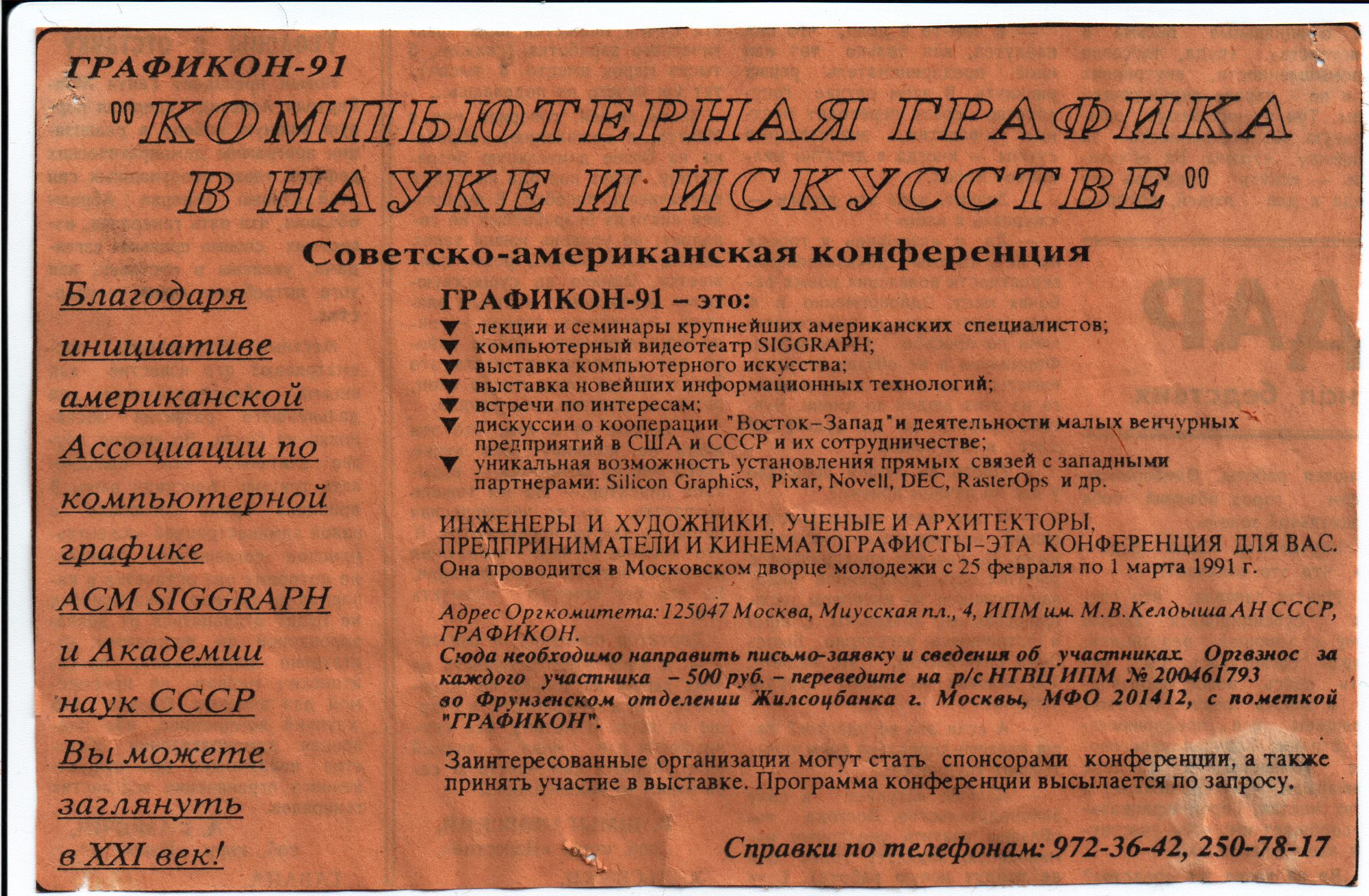 Некий опыт организации научных конференций по машинной графике в СССР конечно был, но мы понимали, что конференцииSIGGRAPH – это совсем другое дело. Это масштабные мероприятия, которые помимо привычных сессионных и секционных докладов включают в себя учебные курсы по актуальным направлениям компьютерной графики и сопряженных областей, круглые столы, семинары, выставки компьютерного искусства, видео-шоу, выставку серийного и экспериментального оборудования и техники и пр. И, самое главное, на организацию всего этого надо найти деньги, то есть конференцию надо суметь «продать» - найти достаточное число участников (слушателей, докладчиков, экспонентов выставок), чтобы сформировать бюджет.
