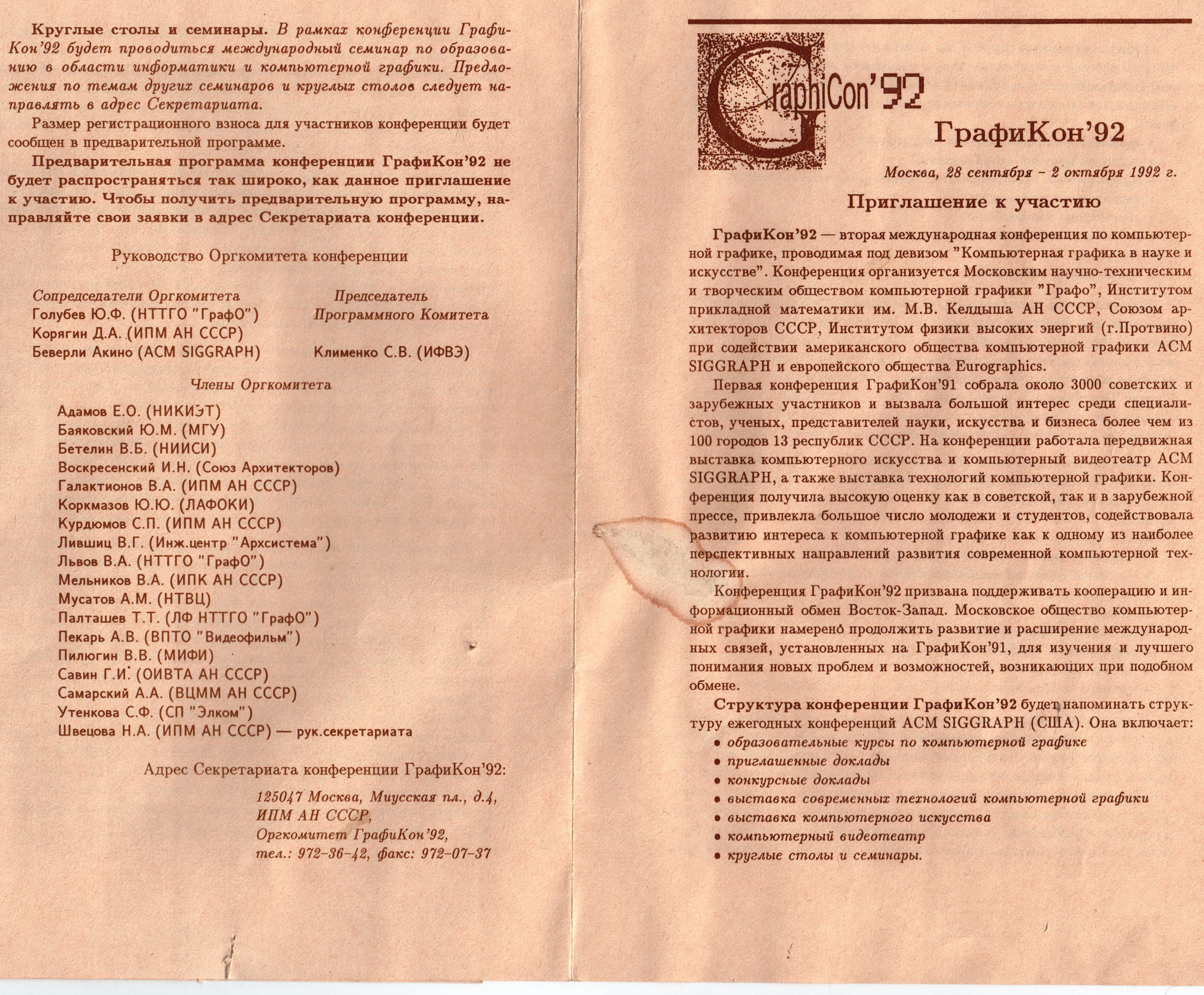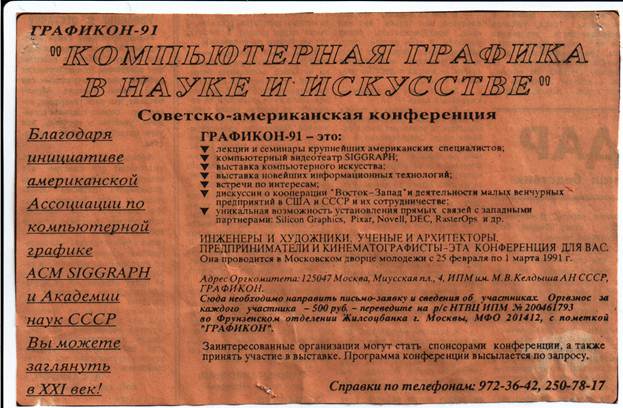 Рис. 11. Приглашение к участию в следующей конференции Графикон – Графикон-92, которая состоялась в сентябре-октябре 1992 г. в Институте молодежи, бывшей Высшей комсомольской школе ЦК ВЛКСМ, в Кусково, Москва.