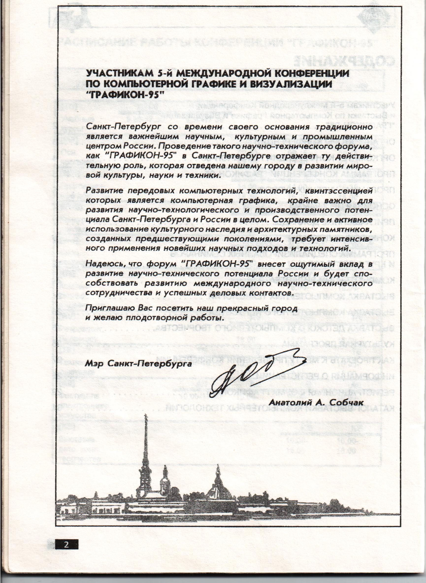 Рис. 13. Приветствие мэра Санкт-Петербурга А.А.Собчака участникам конференции Графикон-95, организованное Т.Т.Палташевым.